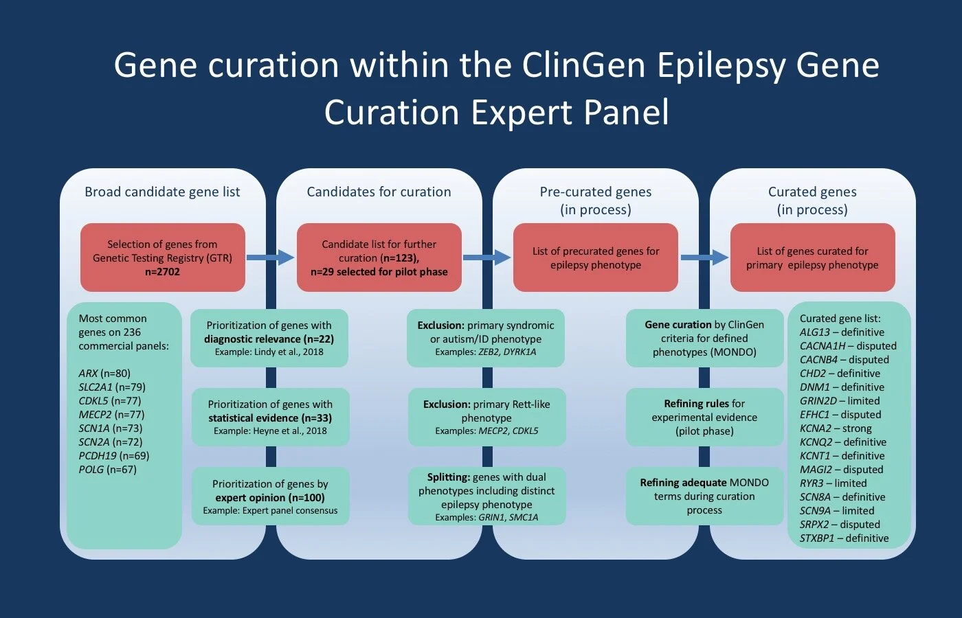 The guardians of the epilepsy genes. We are leaders in the Epilepsy Clinical Domain Working Group of the NIH-funded ClinGen consortium and our role is to evaluate whether suggested genetic causes for the epilepsies are valid. Make no mistake, in our role as the guardian of the epilepsy genes, we have already sent several alleged epilepsy genes into early retirement. Epilepsy gene curation is a critical link between the epilepsy sphere and the concepts and frameworks used in laboratory medicine.